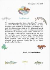 18 Bachpaten, zuständig für einen ca. 100 m langen Abschnitt der Attert im Park von Colmar-Berg nahe des Wehrs. 18 parrains de rivières, responsables pour un tronçon de rivière sur l'Attert près du parc de Colmar-Berg et à proximité du barrage. 1. und 2. Bachbegehung am 2. und 6. Mai 2003 1ère et 2ème sortie le 2 et le 6 mai 2003 Aufgaben: Suchen, Fangen und Bestimmen der wirbellosen Tiere im Bach. Bestimmen der biologischen Wasserqualität. Missions: Chercher, collecter et déterminer les macroinvertébrés de la rivière. Déterminer la qualité biologique de l'eau. 3. Bachbegehung am 6. Juni 2003 3ème sortie le 6 juin 2003 Aufgaben: Bestimmen der chemischen Wasserqualität (pH, Nitrate). Messen der Fliessgeschwindigkeit. Missions: Déterminer la qualité chimique de l'eau (pH, nitrates). Mesurer la vitesse du courant. 4. Bachbegehung am 13. Juni 2003 4ème sortie le 13 juin 2003 Aufgaben: Bestimmen der chemischen Wasserqualität (pH, Nitrate). Messen der Bachbreite und der Fliessgeschwindigkeit. Bestimmen des natürlichen Bachzustandes anhand eines Bachtestes. Missions: Déterminer la qualité chimique de l'eau (pH, nitrates). Mesurer la largeur de la rivière et la vitesse du courant.Evaluer l'état naturel du cours d'eau à l'aide d'un test. |