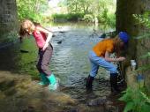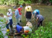 18 Bachpaten, zuständig für einen ca. 100 m langen Abschnitt an der Attert, nahe der "Schummeschmillen" in Redingen.. 18 parrains de rivière, responsables pour un tronçon de rivière sur l'Attert, près de la "Schummeschmillen" à Redange. 1. und 2. Bachbegehung am 13. Juni und am 4. Juli 1ère et 2ème sortie le 13 juin et le 4 juillet 2003 Aufgaben am 13. Juni: Suchen, Fangen und Bestimmen der wirbellosen Tiere im Bach. Aufgaben am 4. Juli: Fangen und Zählen der wirbellosen Tiere aus einer Stichprobe (je 10 Steine). Bestimmen der biologischen Wasserqualität des Baches. Bestimmen der chemischen Wasserqualität (pH, Nitrate). Missions le 13 juin: Chercher, collecter et déterminer les macroinvertébrés de la rivière. Missions le 4 juillet: Collecter et compter les invertébrés trouvés sous 10 cailloux. Déterminer la qualité biologique de l'eau. Déterminer la qualité chimique de l'eau (pH, nitrates). |